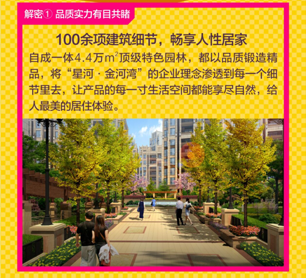 无论是还是自成一体4.4万㎡顶级特色园林,都以品质锻造精品,将“星河·金河湾”的企业理念渗透到每一个细节里去,让产品的每一寸生活空间都能享尽自然,给人最美的居住体验。