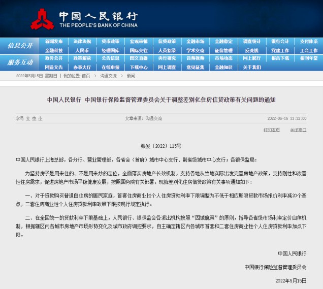 5月15日,中国人民银行、中国银行保险监督管理委员会发布“关于调整差别化住房信贷政策有关问题的通知”。