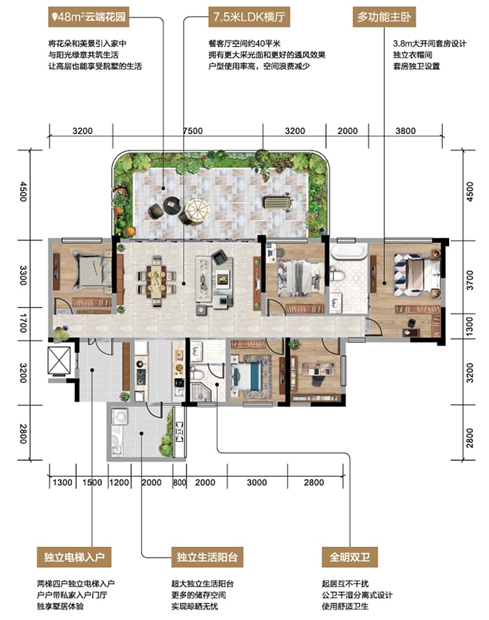功能分区合理,布局巧妙,超48㎡云端花园,奢享IMAX级阳光风景;约7.5m大横厅,LDKG设计,打破空间界限,为生活理想埋下伏笔;全周期家庭空间,生活游刃有余。南北通透,通风采光好,阔景五房,进阶人生一步到位。