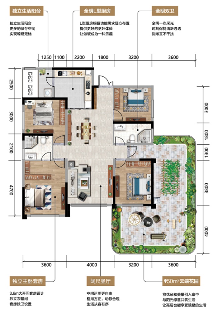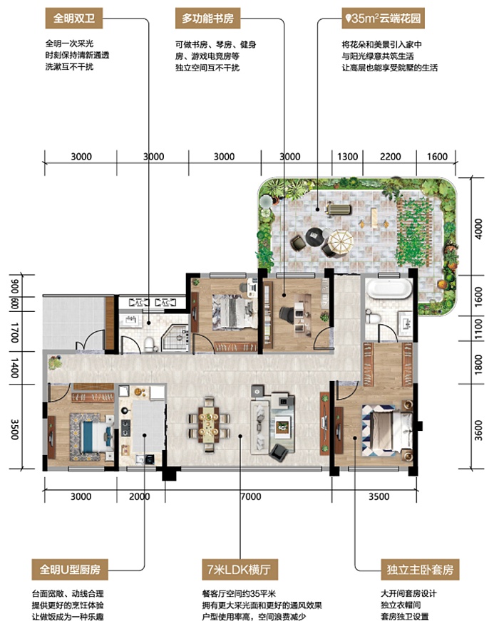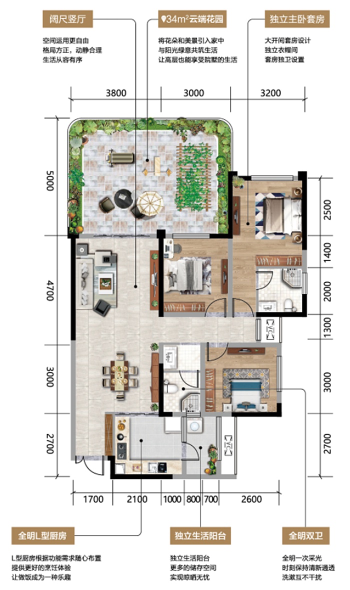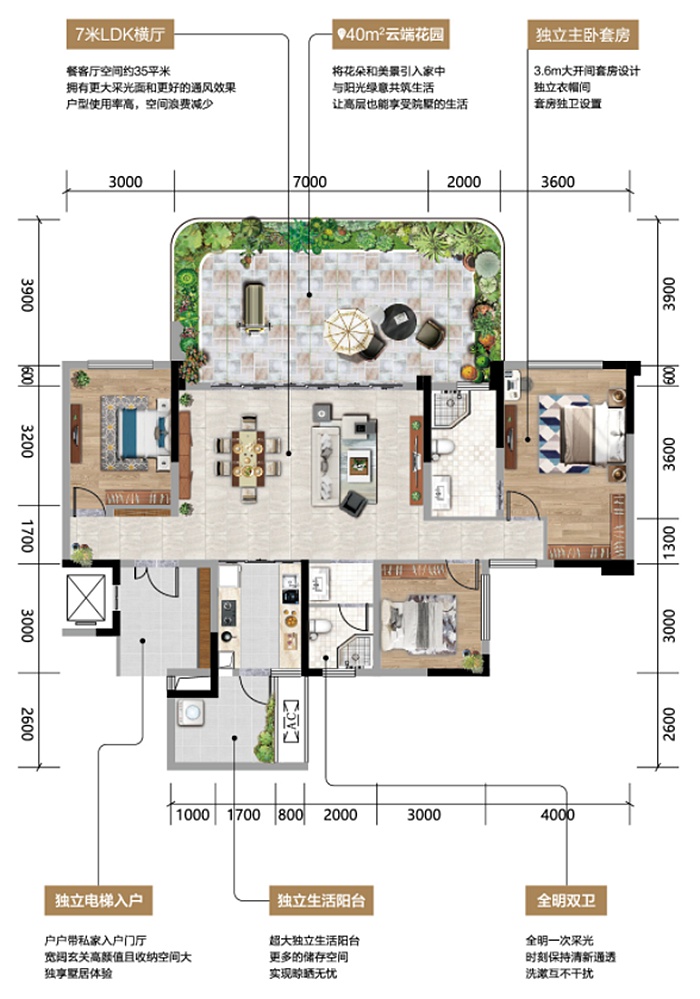 从居住的实用性、功能性和舒适性出发,三居室均有采光通风窗户,每天在阳光中苏醒,光线明媚整个卧室空间;约50㎡L型转角大花园,每天都可在大露台享受阳光赠与的美妙风景,尽可将情绪融入一杯咖啡、一本书里,享受这悠然的惬意生活。