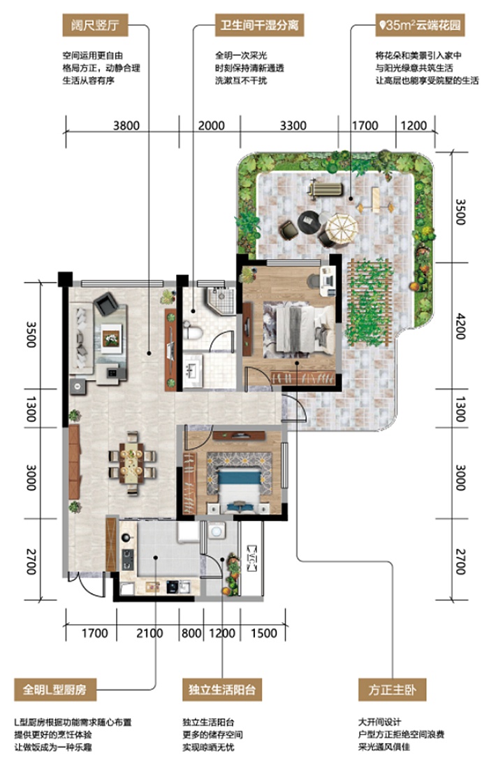 只需81㎡即可体验大户型135㎡的舒适感!科学布局精心考量,最大化满足生活所享,自带35㎡大花园,满足你内心的花园梦!L型厨房连生活阳台,空间利用最大化,方便琐碎生活,细节体现关爱。