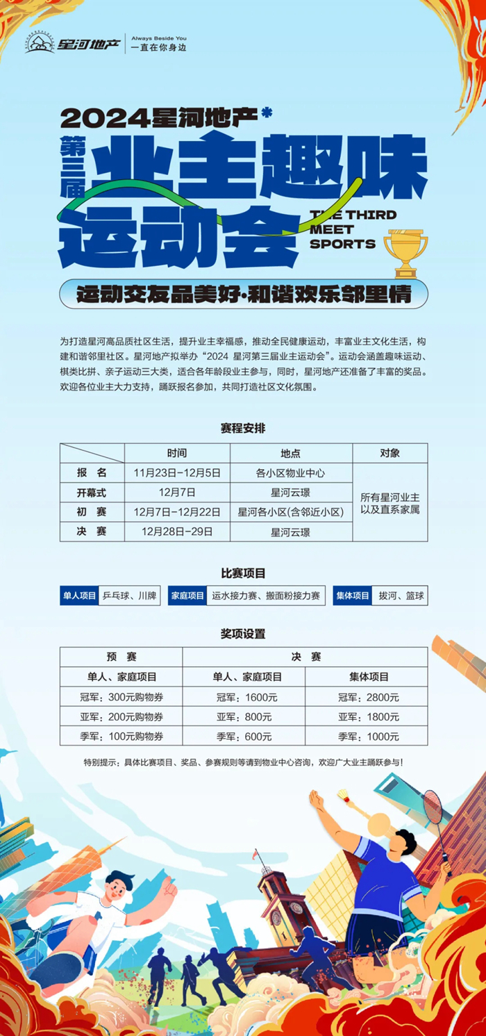 星河一直致力于打造高品质生活,这场业主趣味运动会就是想为大家提升幸福感,拉近邻里情。各位业主别观望,大力支持、踊跃报名,让咱们携手打造超有爱的社区文化氛围,留下美好难忘的邻里记忆。