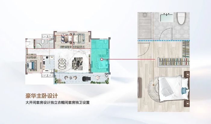 豪华主卧套房设计,一方私密的奢华天地。动静相宜的布局,将休憩与起居优雅划分。大开间套房,尽显尊荣气度。独立卫生间,于静谧中享受舒适的沐浴时光;专属衣帽间,收纳时尚与精致。在这里,诗意与私密共舞,每一刻都是对品质生活的极致演绎。
